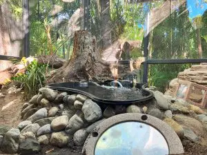 We started off the year strong with our macaw bridge, which stretches across our main boardwalk near the entrance of our Lands of Change loop. Previously, our macaws lived on the loop-side of the boardwalk, while our flamingos’ nighthouse was located on the opposite side. However, our team noticed that our flamingos seldom used their nighthouse and preferred to stay in their pond area instead. So, we made use of the space by turning it into extra space for our macaws!