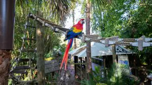Our animal care team worked hard over several months to form structures leading up to a bridge which crosses the boardwalk. Now, the macaws enjoy their time from new heights!