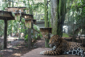 Eventually, we began a thorough introduction process broken down into several stages. We began with a “full howdy,” meaning Khan and Lua took turns living in one of our habitats; This let each jaguar familiarize themselves with the other’s scent and prepared them for the next step. We then began allowing the cats to see and smell each other through the mesh. Finally, we introduced the two in the same habitat, slowly building up the increments of time the two spent together.