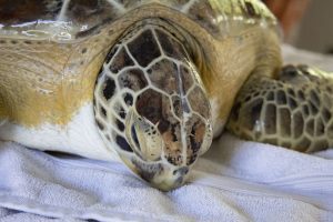 On top of the traumatic injury Mango suffered, this turtle also arrived with fibropapillomatosis (FP) tumors. While there is no cure for this viral disease, these tumors can be surgically removed. Our team removed the most life threating tumors from Mango’s left front flipper, and their surgical site has been healing well. While these tumors can be debilitating for some turtles, we do not expect this disease to impact Mango’s release.