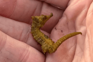 Fred: The amazing experience for me was when I pulled up one of the cages, and there was a small seahorse hanging on by its tail. I did not expect to find a seahorse here in Sykes Creek, so this was a very cool discovery.